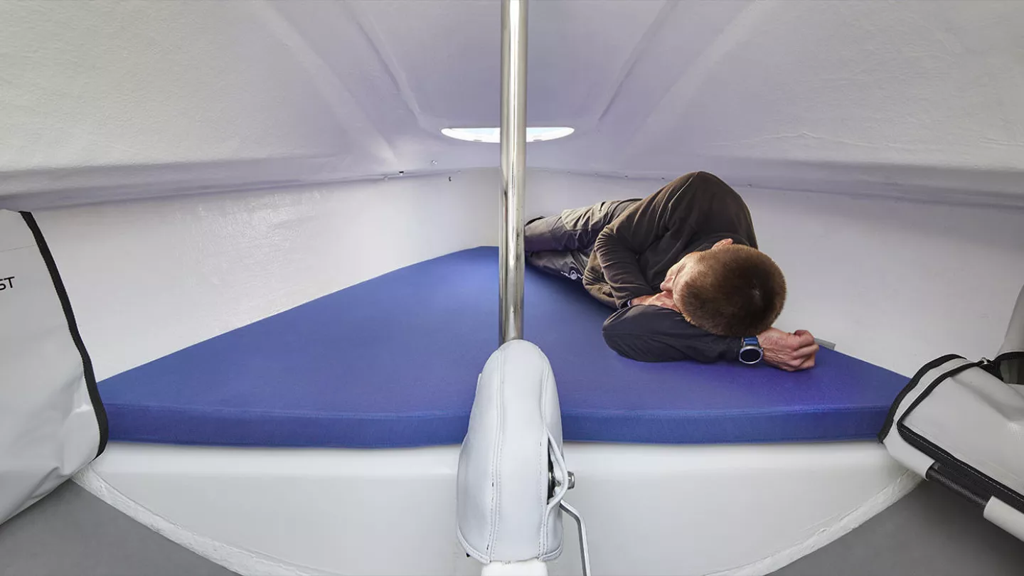 SOLICITA TU PRUEBA DE MAREl First 18 SE se parece a un derivador por su fogosidad, es no obstante mucho menos voluble gracias a su manga y a su profunda quilla elevable. Los dos timones aseguran un control preciso en todas las condiciones incluso en el planning a plena velocidad. Todas las maniobras están simplificadas al extremo y favorecidas por un acastillaje de calidad ; el foque es sobre enrollador, el spi asimétrico con un sistema de arriar, el mástil carbono permite prescindir de un backestay y ofrece la posibilidad de una vela mayor cuadrada en su parte superior que mejora las prestaciones con poco viento. La organización de la bañera facilita la utilización en solitario pero permite también acoger 2 o 3 tripulantes. ¡Le toca a Ud. imaginar el programa, el First 18 SE está listo! A pesar de su tamaño modesto, el camarote del First 18 SE acoge dos adultos en modo camping costero. La doble litera en V es de buen tamaño y los sacos de estiba movibles permiten almacenar sus cosas personales mientras que el gran cofre bajo la bañera está dedicado a los equipos técnicos. El confort es cierto es reducido con relación a los veleros de crucero más tradicionales pero el First 18 SE es perfecto para ampliar su radio de navegación y darle acceso a las calas y playas secretas. Gracias a la quilla elevable completamente integrada al casco y a los timones movibles, nunca ha sido tan fácil poner su barco en la playa...