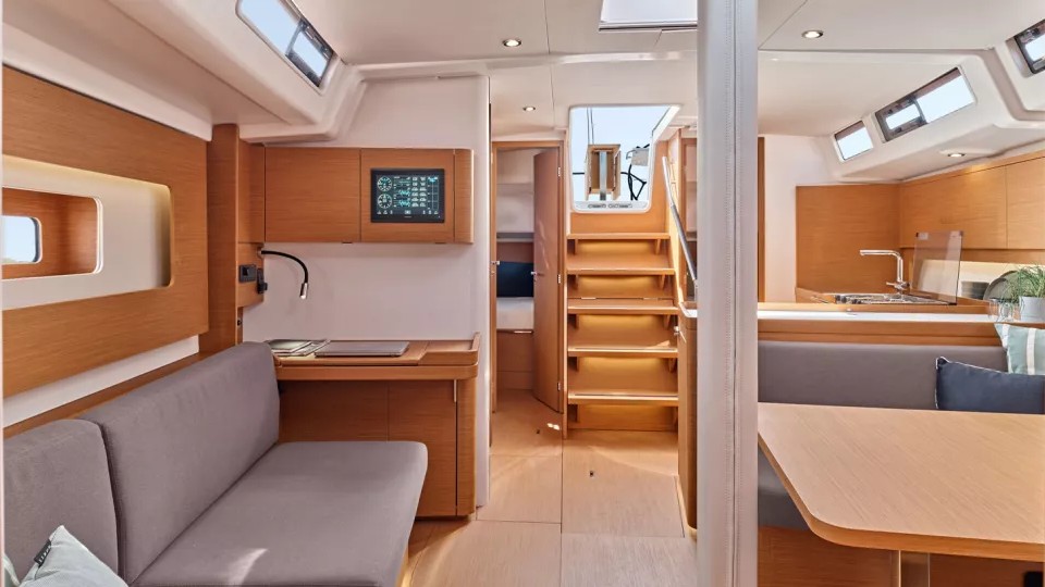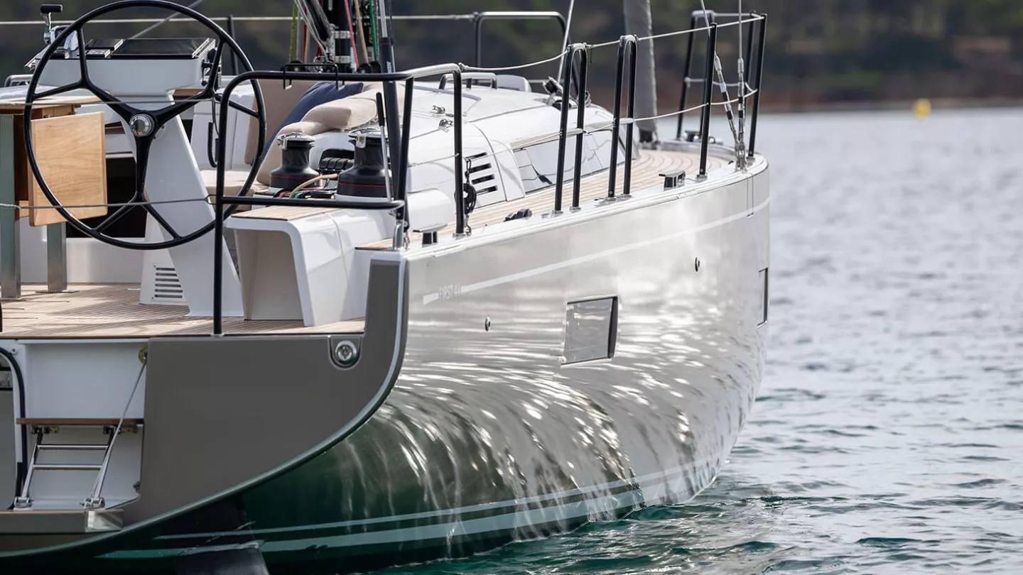 SOLICITA TU PRUEBA DE MARA bordo del First 44, la bañera destaca por su manejabilidad, con una bella mesa exterior así como por su fluidez, con un acceso a la misma altura, a los amplios y despejados pasavantes. 4 winches y un punto fijo de escota de vela mayor, así como el mástil retrasado, permiten sacar provecho de un plano de velamen moderno compuesto por una vela mayor esbelta y generosas velas de proa. 2 lastres de 350 litros, activables eléctricamente desde las consolas de rueda, ofrecen la posibilidad de conservar todo el potencial del barco incluso con tripulación reducida. Fiel al enfoque científico que heredó de la America's Cup, Roberto Biscontini ha llevado a cabo numerosas simulaciones e iteraciones para producir un casco potente y bien equilibrado. Combinado con un generoso plano vélico, el First 44 es vivo y eficaz en todas las condiciones. El First 44 disfruta de un interior luminoso, moderno y depurado, combinando lacado blanco, madera moldeada y tapicería cuidada. Compuesto de tres camarotes y dos aseos, el interior se basa en la calidad de los acabados y los materiales para crear un ambiente refinado. En el salón, la mesa transversal puede acoger hasta seis personas, frente al sofá y al puesto de navegación ; su disposición con relación al mástil facilita la circulación entre la cocina y el camarote armador, lo que acentúa la sensación de espacio.