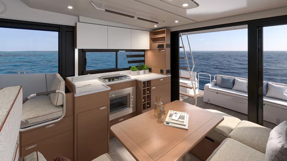 SOLICITA TU PRUEBA DE MARLa espectacular configuración del flybridge ofrece una posición elevada del puesto de mando para una excelente visibilidad, junto con un asiento en forma de U muy acogedor con respaldo adaptable hacia delante, mesa y nevera integrada. Incluso con esta configuración clásica, queda mucho espacio para guardar los juguetes acuáticos, además de acoger las modernas instalaciones de ocio y navegación. La interacción social es el elemento central del diseño de la cubierta, con una cocina en forma de U y un sofá que crean una sensación de amplitud. A ello se suman las numerosas opciones de almacenamiento y la posibilidad de instalar un frigorífico y un congelador de gran capacidad. El sofá se convierte rápidamente en una litera doble con cortina para mayor intimidad. Adicionalmente, hemos incorporado una innovadora mesa elevable que se transforma de manera inteligente en una cómoda estación de trabajo. En la planta inferior destaca el espacioso camarote del propietario, así como el cuarto de baño principal, que cuenta con puertas tipo Jack & Jill y una cabina de ducha independiente. La cocina y el cuarto de baño cuentan con encimeras Corian de serie, mientras que el nuevo paquete Luxe, que aporta mayor comodidad y un nuevo diseño, permite disfrutar aún más de la vida a bordo. Este moderno crucero es el espacio perfecto para la vida familiar y la diversión, desde neveras bien equipadas hasta camarotes repletos de equipamiento y espacios de almacenamiento idóneos para los cruceros prolongados con fiabilidad y prestaciones garantizadas.